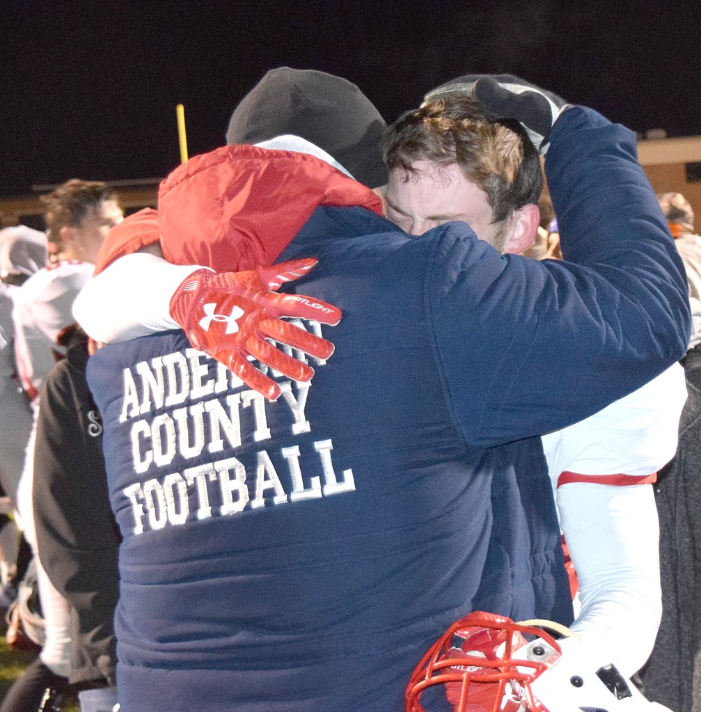 Mark Peach consoles his son, Brett, after Anderson County had fallen to Madison Southern in a hard-fought game in the second round of the 2017 state playoffs. (Photo by John Herndon)