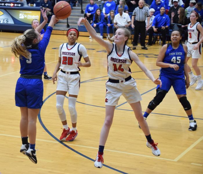 Paige Serafini blocks a shot during Anderson County’s 77-67 win over Simon Kenton in the 2022 Eighth Region Tournament. (Photo by Stephanie Herndon)