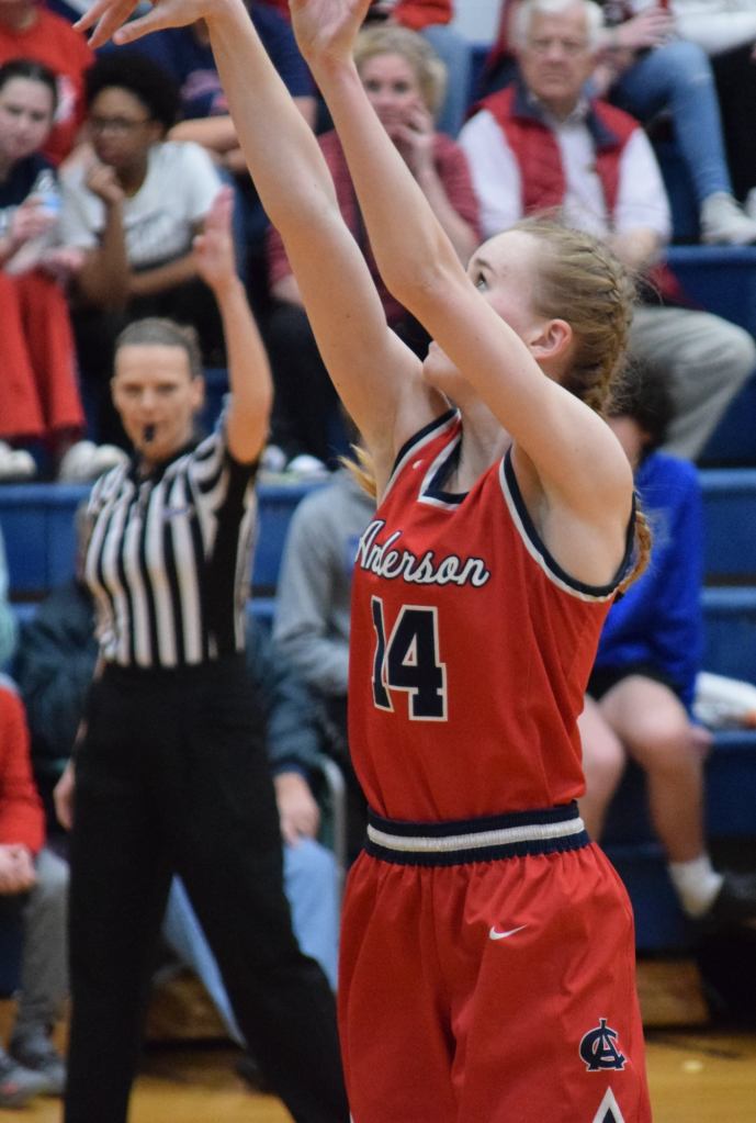 Paige Serafini (14) goes on the attack for Anderson County against Sacred Heart in the 2022 Mingua Beef Jerky Girls’ Sweet 16. (Photo by Stephanie Herndon)
