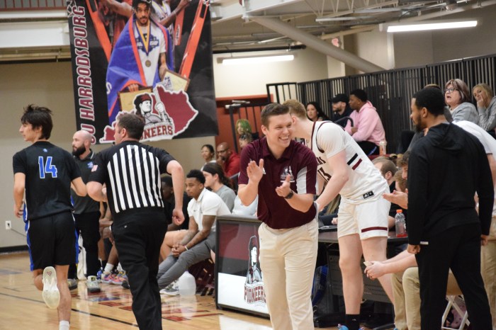Campbellsville-Harrodsburg head coach Austin Sparrow (front), Warner Bryan and assistant coach Zach Freeman celebrate as the Pioneers take control of their NCCAA matchup with Great Lakes Christian on Feb. 3, 2023. Pioneers go from 'hunted' to 'hunters' By John Herndon, 110forChrist.com HARRODSBURG – As Austin Sparrow greeted the visitor to the Conover Education Center Athletic … Continue reading Pioneers hunting for another national championship