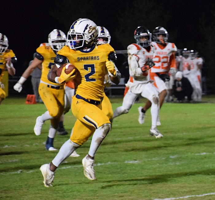 Sayre players Caden Jones (3) and Brock Coffman (2) celebrate after Coffman's touchdown reception gave Sayre a quick 6-0 lead against Paris. (All photos by John Herndon) Spartans' road to championship paved with traditional values By John Herndon LEXINGTON – It didn't take long to find out something was refreshingly different about Sayre football. I … Continue reading NEW POWER SAYRE TAKES CLASSICAL APPROACH TO SUCCESS