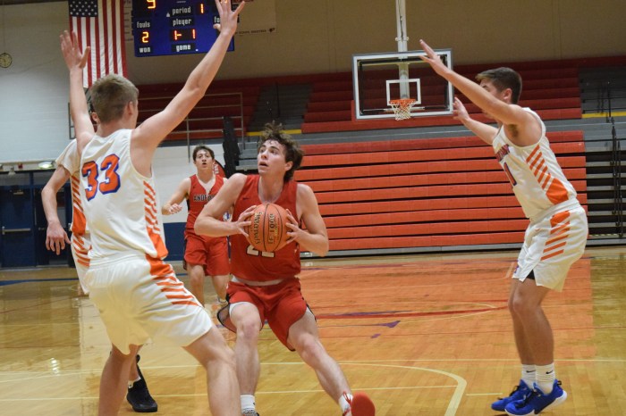 Anderson County’s Hunter Rutherford tries to get the the basket as Frankfort’s Nathaniel O’Bryan (33) and Panther teammates defend.