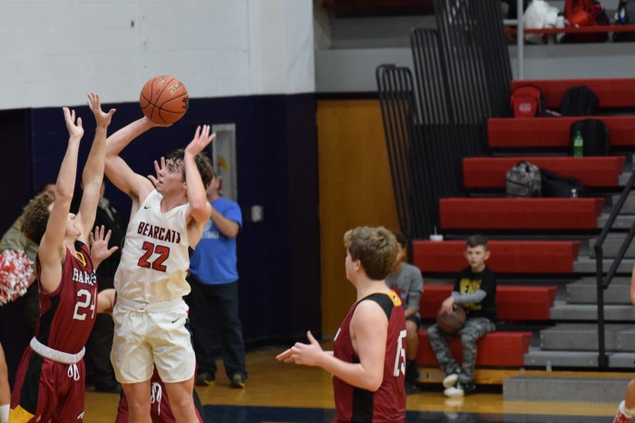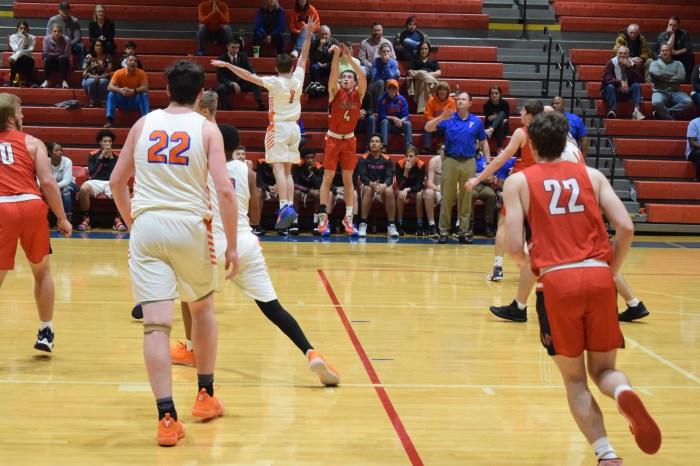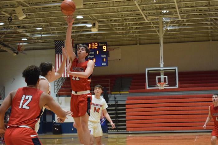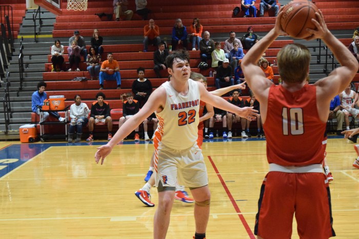 Frankfort’s Jordan Blythe shoots over Anderson County’s Alex Carpenter as Frankfort’s Jackson Twombley looks on.