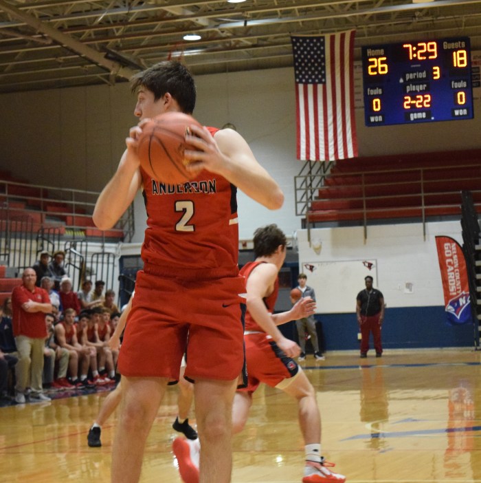 Anderson County’s Jagger Gillis pulls down a rebound early in the third quarter against Frankfort.